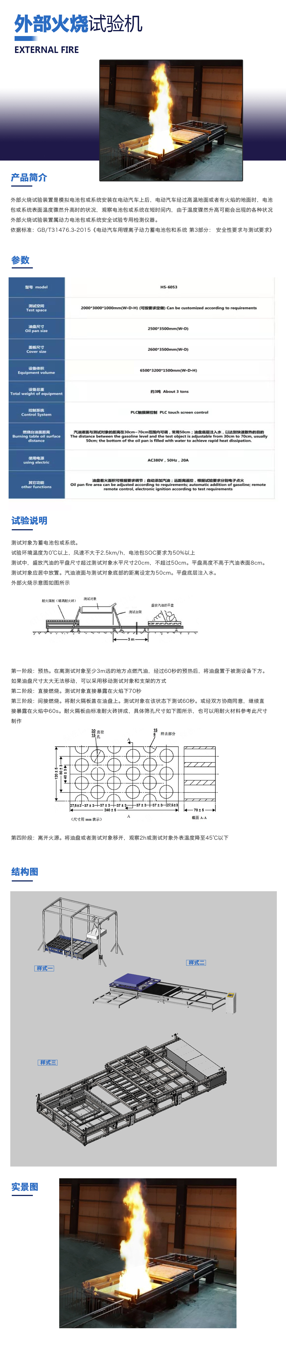 用途:外部火燒試驗裝置是模擬電池包或系統安裝在電動汽車上后,電動汽車經過高溫地面或者有火焰的地面時,電池包或系統表面溫度驟然升高時的狀況,觀察電池包或系統在短時間內,由