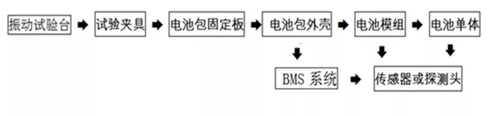 電池的振動(dòng)試驗(yàn)涉及到振動(dòng)能量的傳播,這涉及到能量的傳播方向或路徑,試驗(yàn)樣品安裝應(yīng)符合GB/T2423.43的要求,如果樣品安裝方式不當(dāng),往往會(huì)改變振動(dòng)能量的真實(shí)傳播,最終影響到試驗(yàn)結(jié)果。電池振動(dòng)試驗(yàn)的能量傳播方向和路徑見圖2:振動(dòng)能量傳播示意圖。